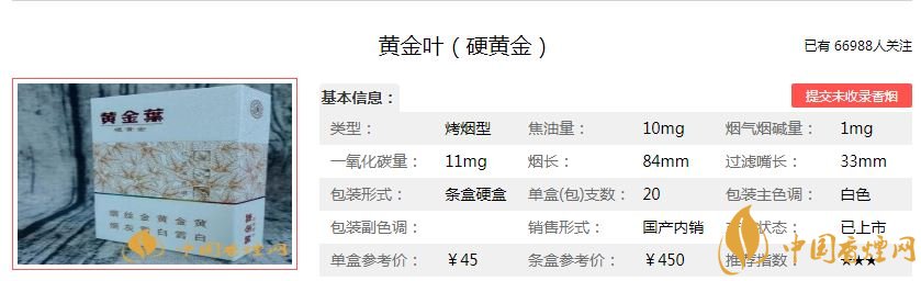 黄金叶硬黄金烟支长84mm,过滤嘴长33mm,烟支的设计很漂亮,淡粉红色的叶形状加上金色的承托,更显出此烟的与众不同,握在手里的感觉也十分舒适。下面我们一起来看黄金叶硬黄金的参数信息:焦油量:10mg 烟碱量:1.0mg 一氧化碳量:11mg。