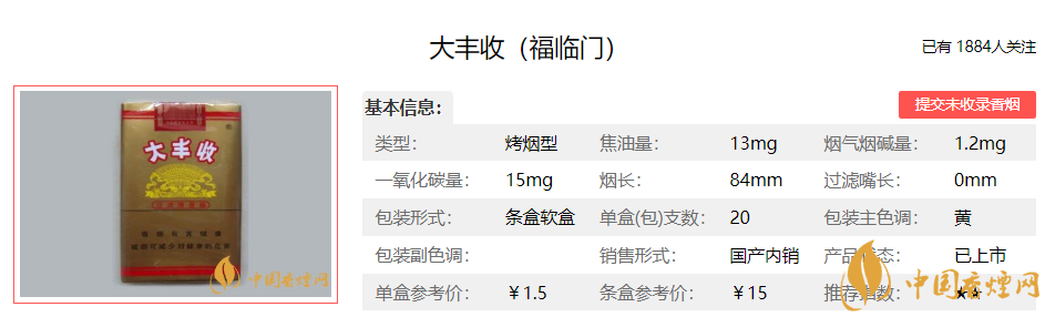 "大丰收"品牌是国家烟草专卖局为适应农村消费者和低收入群体的需求,首个重点扶持的低档全国性牌号卷烟。精心选择原辅材料和香精香料。使其闻香甜润,烟香醇和,口感舒适,劲头适中。