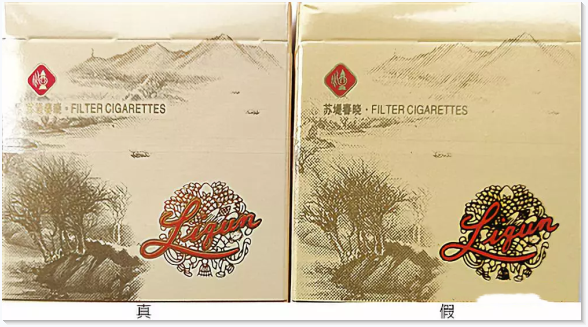 1.正面商标纸印刷工艺差异对比:真品商标纸采用胶印印刷,中间“利群”文字及拼音采用压凸烫金工艺,用手摸凹凸感明显,“苏堤春晓”主体图案颜色较深;假烟采用高清扫描仿制印刷,中间“利群”文字及拼音用手摸无凹凸感,“苏堤春晓”主体图案颜色较淡,商标纸整体颜色偏黄。