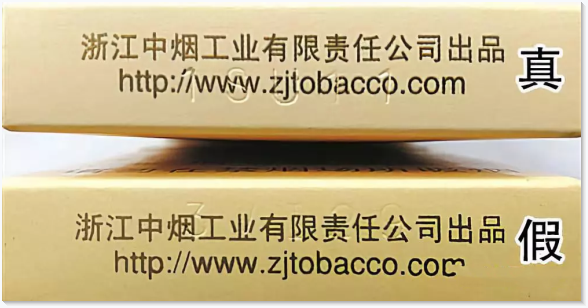 3.小盒底部钢印差异对比:真烟钢印为机器动态打印,整体钢印较深、间距不等,其位置与企业网址重叠;假烟钢印一般为手工静态打印,钢印较浅,位置与文字重叠。