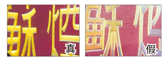 真烟烫金字体线条清晰、不漏金,金色部分成色纯正;假烟烫金字体线条不清晰,有漏金现象,金色部分成色暗淡。