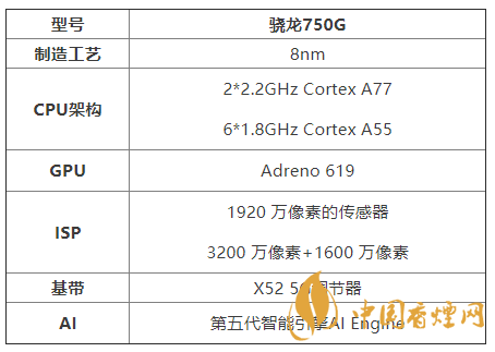 骁龙750G采用三星8nmEVU制程工艺,CPU由两颗2.2GHz的Cortex A77核心和六颗1.8GHz的Cortex A55小核组成,性能较骁龙730G提高20%; GPU则为Adreno619, 性能较骁龙730G提高10%;