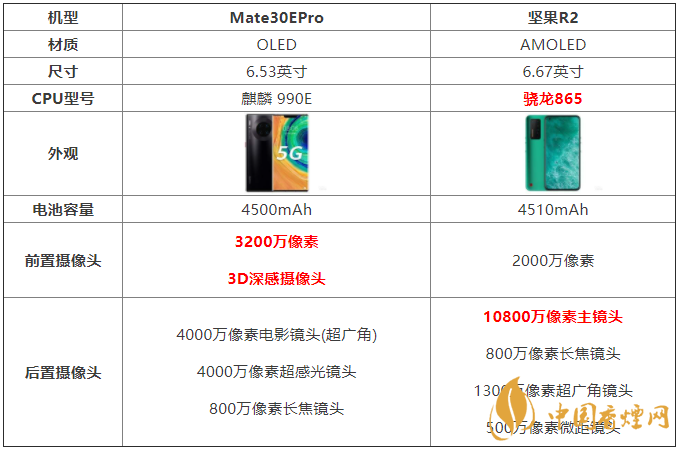 对比结果:前置Mate30EPro像素规格较高,后置坚果R2主摄较高,其他Mate30EPro比较好