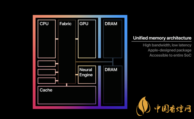 它与iPhone和iPad里面的苹果芯片非常相似,只是功能更强大。它利用了苹果公司的统一内存架构(UMA),这意味着全部内存(DRAM)与需要访问内存的各种部件(比方说CPU、GPU、图像处理器以及神经引擎)都是在同一块芯片上。其结果是,整块芯片都可以访问数据,而不需要在不同部件之间复制数据,也不需要进行互连。对内存的访问有着极低的时延与极高的带宽。其结果是更低功耗、更好性能。