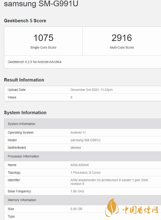 搭载 高通骁龙888 处理器的三星S21,单核跑分为1075分,多核跑分为2916分。