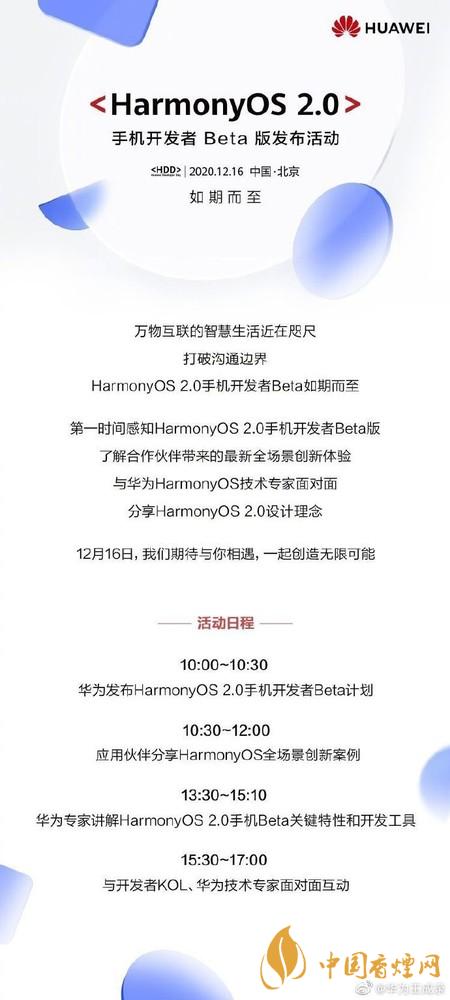 华为王成录 表示:“HarmonyOS正沿着我们在HDC上公布的路标快速成长,转眼又迎来新的里程碑。12月16日我将在北京发布HarmonyOS 2.0手机开发者Beta版本,欢迎合作伙伴、开发者朋友们来一起探索,一起创造。”除此之外,他还在微博上发出了本次活动的预热海报以及活动流程。