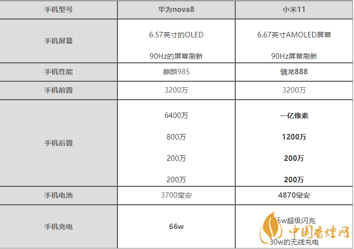 华为nova8搭载3700毫安的电池,支持66w的充电速度。小米11搭载4870毫安的电池,支持55w的有线充电和30w的无线充电