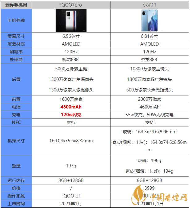 小结:前置方面小米11的像素更高,后置方面小米11的主摄像素相对来讲较高,但是iQOO7pro采用了焕彩人像技术,规格更高,在其他摄像头方面iQOO7pro的参数也是更高。
