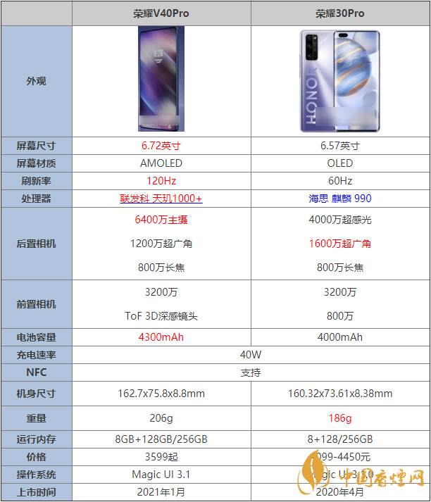 荣耀V40Pro和荣耀30Pro:都支持40W有线快充的基础上,荣耀V40Pro的4200mAh电池容量更大,为用户使用带来更好的电量保障。