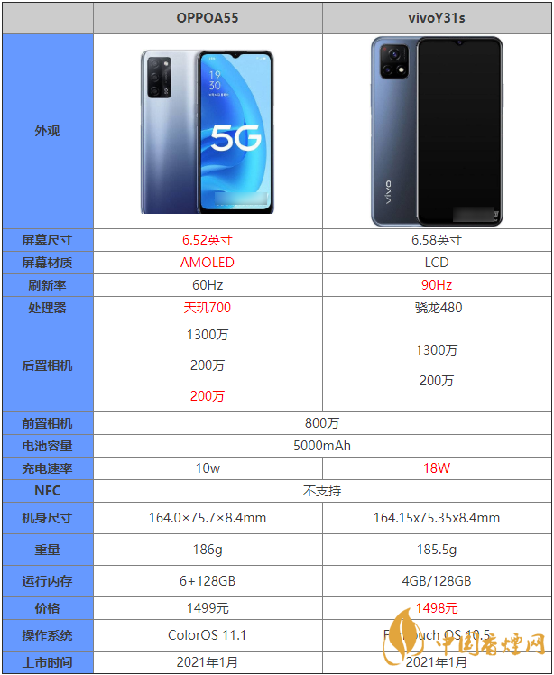 OPPOA55:采用6.52英寸AMOLED屏幕,水滴屏中央挖孔设计,分辨率2400x1080像素,屏幕刷新率60Hz
