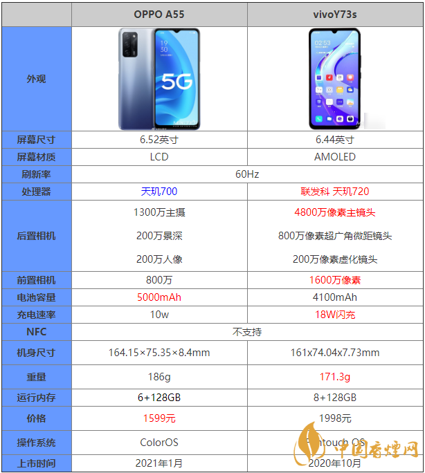 OPPOA55和vivoY73s哪款手机更好 参数对比详情