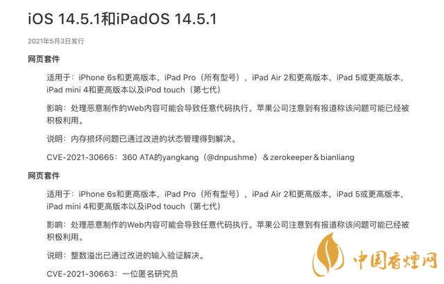 漏洞可被利用制作恶意网页内容导致任意代码执行,苹果已在 iOS 14.5.1 系统上解决了该问题。