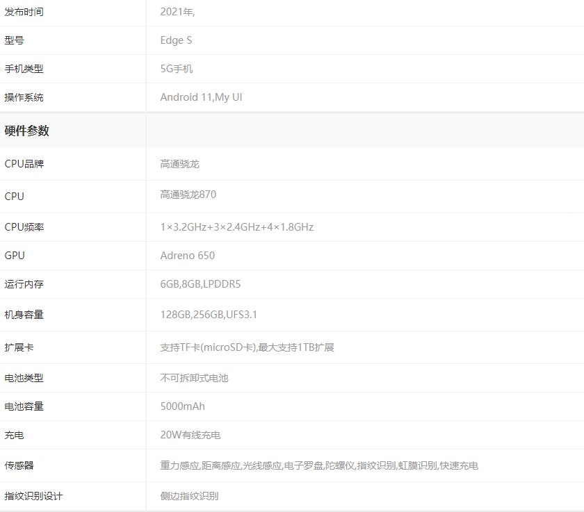 motorola edge s有三个存储版本,分别为6+128GB、8+128GB和8+256GB,目前8+256GB暂未开售。更良心的是,这款新机支持最高1TB的存储卡扩容,对大容量有需求的用户非常友好。从存储可以看出,motorola edge s是一款定位中端的智能手机。