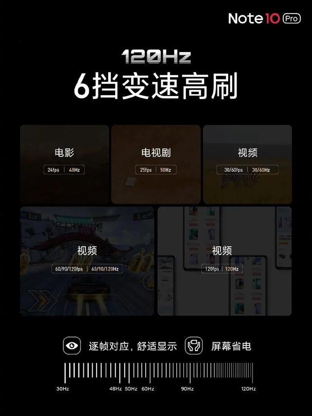 两款新机均支持高刷新率,其中Note 10是90Hz、Note 10 Pro是6.6英寸LCD 120Hz,屏幕分辨率均为2400*1080,支持6档帧率自适应,根据不同显示内容自动匹配。