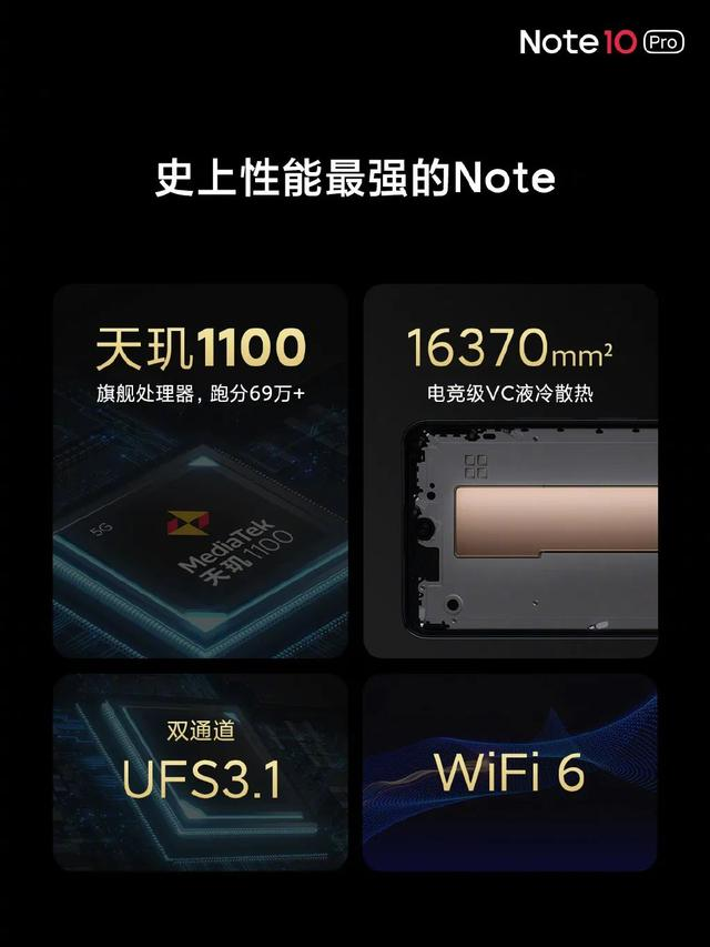 Note 10 Pro搭载天玑1100旗舰处理器,而且经过了Redmi独家调校,支持GPU驱动独立升级,配备同价位罕见的UFS 3.1闪存,号称史上性能最强的Note。