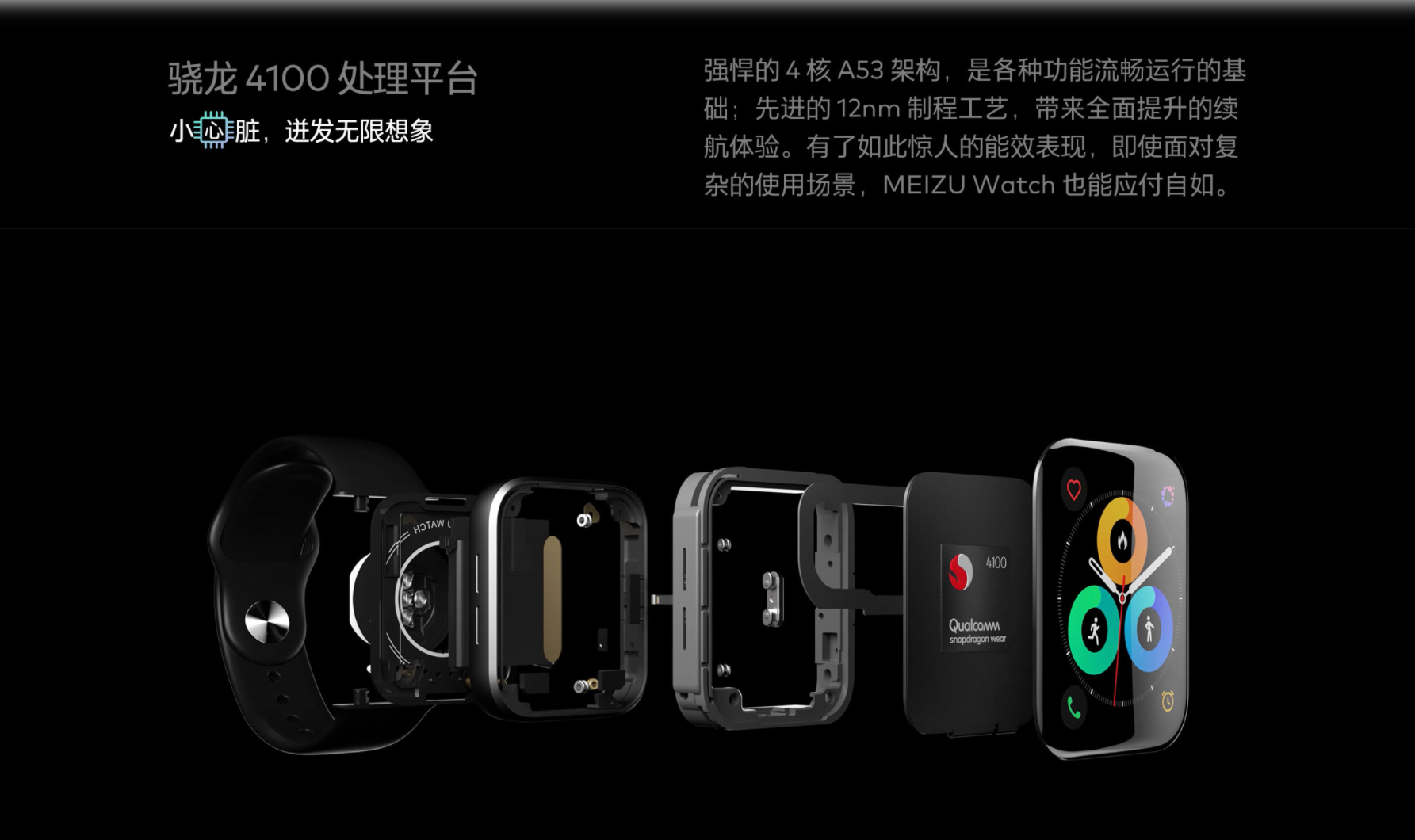 核心性能上,魅族智能手表采用了基于“手机级”的硬件开发,它搭载了高通骁龙Wear 4100旗舰芯片,可以更好实现全智能特性。