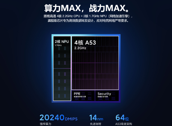 小米路由器AX9000的处理器使用了14nm制程工艺的高通IPQ8072,这是目前路由器处理器中量产化的最先进制程工艺,主频达到了2.2GHz,采用4核64位A53构架,芯片算力达到20240 DMIPS,这是目前路由器行业中最高的。
