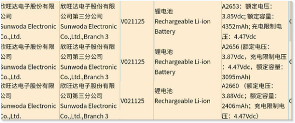 近期新iPhone的电池也通过了3C认证,数据显示型号为A2653的机型搭载4352mAh电池,型号为A2656的机型采用3095mAh电池,型号为A2660的机型搭载2406mAh电池。与iPhone 12系列对比来看,iPhone 13系列的续航能力有望得到进一步提升。