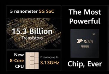 麒麟9000内置了8核CPU核心,大核Cortex-A77核心最高为3.13GHz,3个A77最高2.54GHz,4个A55最高为2.04GHz;Mali G78 GPU,同时还启用了全部24个内核。相比上一代的麒麟990架构芯片,麒麟9000核心数多了一半,性能提升超过了60%。另外,此次麒麟9000还集成了多达153亿个晶体管,比苹果A14的118亿个晶体管还要多出将近30%,这说明麒麟9000在工艺上已经不比苹果A系处理器差了。