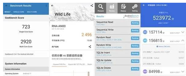 软件实测,CPU部分,荣耀50 Pro Geekbench单核得分723,多核得分2920;GPU部分,3DMark WildLife得分2496;AndroBench读写测试,荣耀50 Pro GB+GB版本顺序读写分别为929.6、593.37 MB/s,随机读写分别183.23、245.84 MB/s;综合性安兔兔V9.0.10-OB,总分523972,整体性能表现是很令人期待的。