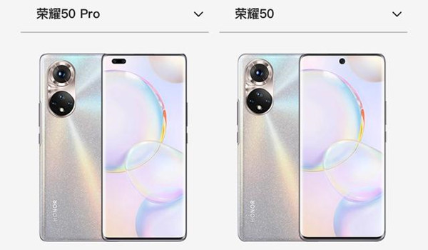 前置相机方面荣耀50配置3200万像素(f/2.2光圈)的单孔相机,荣耀50Pro配置3200万像素(f/2.2光圈)+1200万像素(f/2.4光圈)的挖孔相机,两者均支持2D人脸识别。