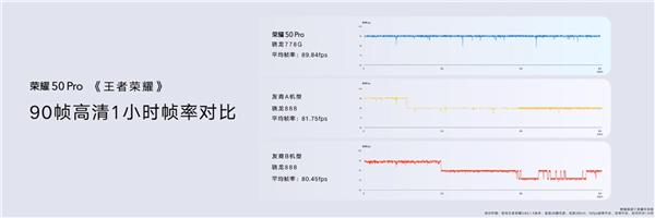 而就在发布会上,荣耀CEO赵明还带来了一张让人惊叹的对比图,在《王者荣耀》90 帧高清1小时帧率对比测试中,荣耀50 Pro平均帧率为89.84fps,而搭载骁龙888的两款友商机型的平均帧率仅为80.45fps和81.75fps,搭载了骁龙778G的荣耀50 Pro对比搭载骁龙888的旗舰不仅没有落下风,甚至还略有超出,着实令人有点出乎意料。