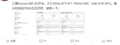从跑分数据上发现,三星Exynos 880处理器相当于骁龙765G,二者分数不相上下。