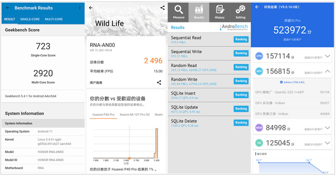 软件实测,CPU部分,荣耀50 Pro Geekbench单核得分723,多核得分2920;GPU部分,3DMark WildLife得分2496;AndroBench读写测试,荣耀50 Pro GB+GB版本顺序读写分别为929.6、593.37 MB/s,随机读写分别183.23、245.84 MB/s;综合性安兔兔V9.0.10-OB,总分523972,整体性能表现是很令人期待的。