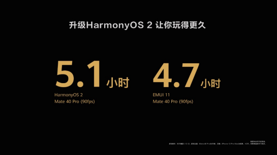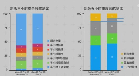 这一项测试内容主要分为三小时综合续航测试和五小时重度续航测试,三小时续航测试更模拟用户的轻度使用场景,HarmonyOS以微弱优势胜出。但是在五小时重度续航测试中,HarmonyOS的优势就非常明显了。