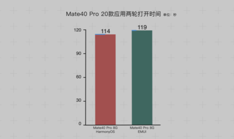 这一项测试采用微信、微博、QQ、淘宝、京东美团等20款常用主流应用,并且测试两轮应用打开时间。数据显示,搭载鸿蒙的Mate40?Pro耗时114秒,搭载EMUI的Mate40?Pro耗时119秒,前者比后者快5秒。