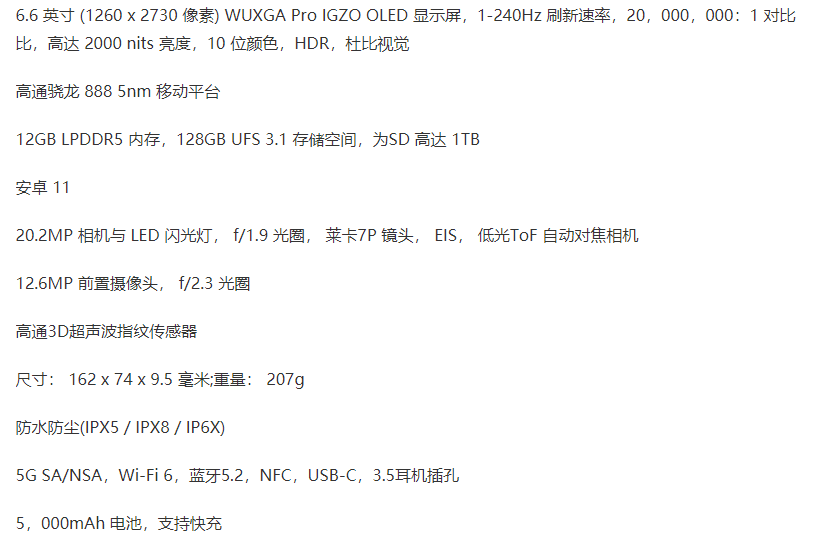 - 不到2K,高于FHD的妖分辨率,仅与IPHONE相当,鬼子给整个名称叫WUXGA+,1260x2730的分辨率,不算高。- 但是,这块夏普的IGZO OLED屏支持1-240HZ的可变刷新率,2000nit激发亮度(应该是10%窗口,否则过分了)和2000万:1的对比度。极为变态的参数,是目前主流旗舰的三星屏所望尘莫及的,看着就令人感觉舒爽。