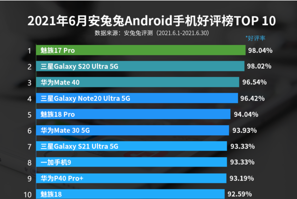 6月好评率排名第二的是三星Galaxy S20 Ultra 5G,好评率为98.02%;第三名是华为Mate40,好评率为96.54%。在此次榜单中,三星、魅族和华为均有3款机型上榜,三个品牌平分秋色。除魅族17 Pro外,魅族今年推出的18系列也受到了不少消费者认可。