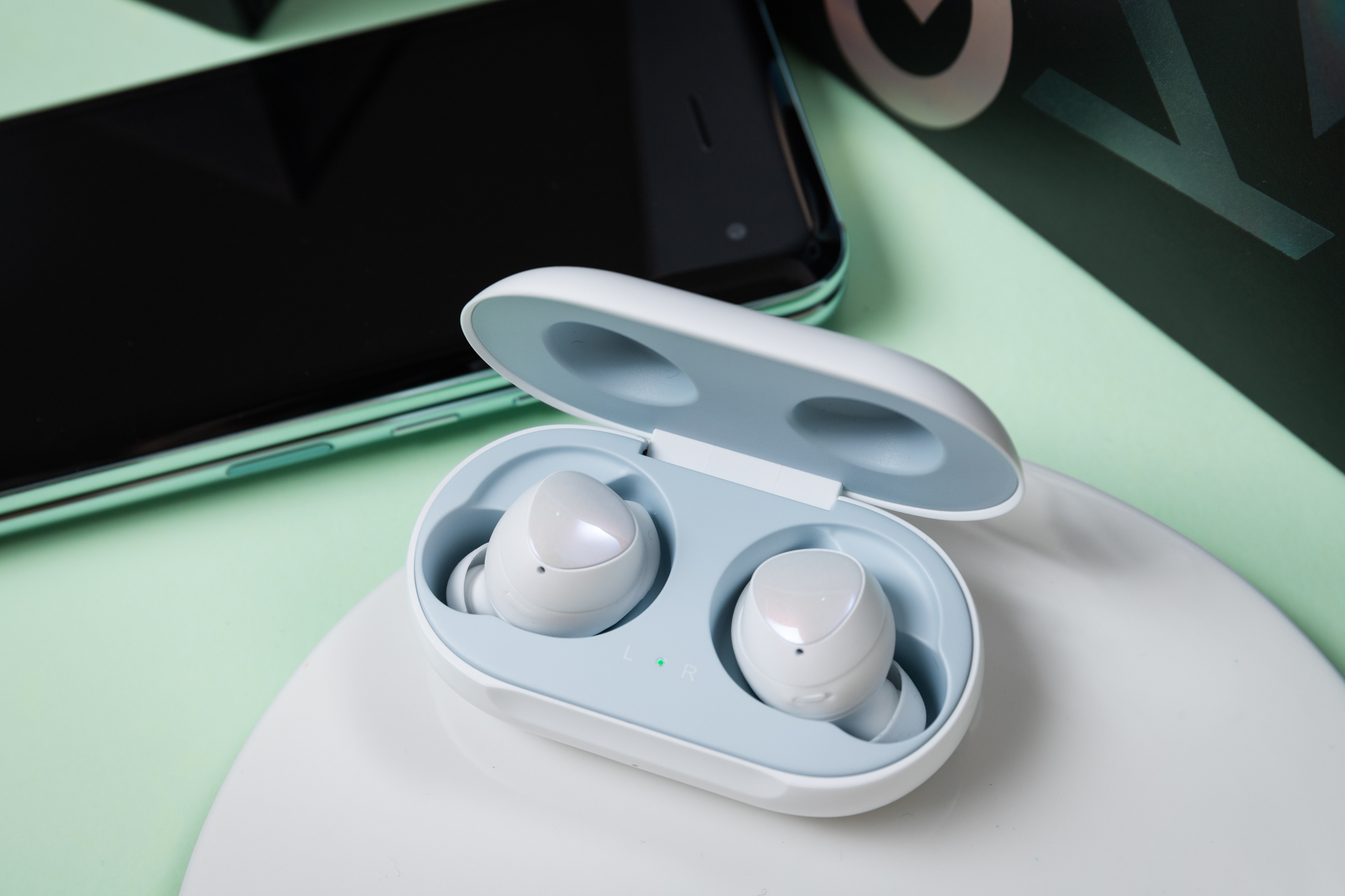 机身内侧可以看到充电连接器和用于磨损检测的传感器触点。既然没有主动降噪,橡胶耳塞可以为用户提供一定的被动降噪功能。充电盒保持了圆润方形的设计,看起来类似于Galaxy Buds Live和Galaxy Buds Pro的充电盒。尽管耳机有四种配色,但是充电盒仅有白色一种,不过盒内颜色与耳机颜色保持了统一。