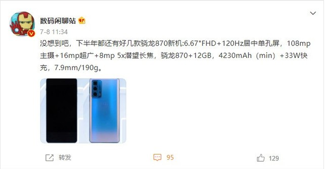 微博原文还提及了本机的更多细节配置:6.67英寸居中单孔屏幕,支持FHD+分辨率以及120Hz屏幕刷新率,摄像方面搭载了1亿像素主摄+1600万像素+800万像素 5x潜望长焦。性能方面,这台机型搭载了高通骁龙870移动平台,最高支持12GB内存。