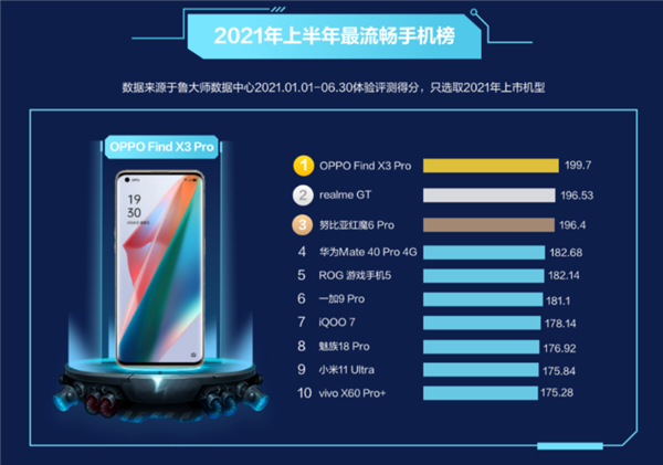 OPPO Find X3 Pro以199.70的均分成为上半年最流畅的一款手机,这款手也是Q1季度流畅度排行榜的冠军。
