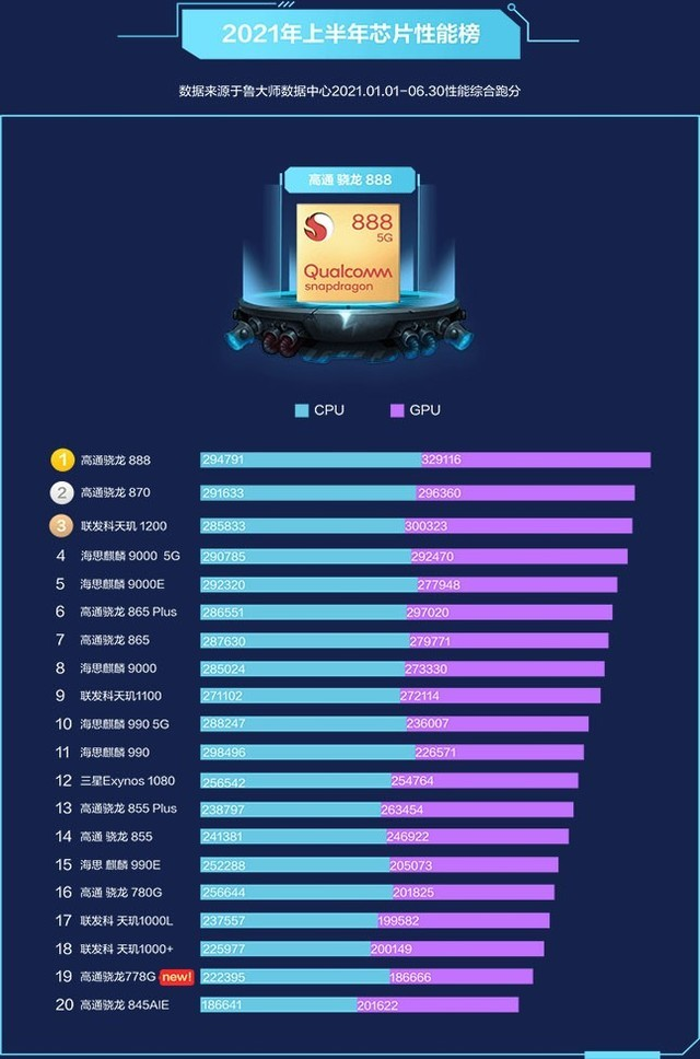 2021年手机芯片最新排行榜,jrs直播最新手机资讯:据小编了解到最近鲁大师官方网站发不了2021年半年榜,其中包括手机性能排行、流畅度排行、以及芯片性能排行等。其中,高通骁龙888移动平台不负众望,勇夺2021年上半年芯片性能排行榜桂冠,网友直呼:“骁龙888,永远滴神!”下面就是小编为大家整理关于2021手机芯片排名前十名榜单的相关内容,希望对大家有所帮助!