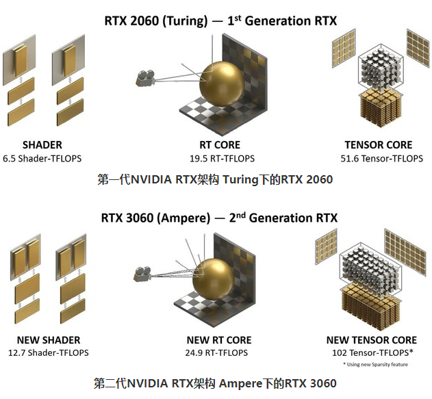 全新的Tensor Core可自动识别并消除不太重要的DNN权重,处理稀疏网络的速率是Turing的两倍,算力高达102 Tensor TFLOPS,而Turing为51.6 Tensor TFLOPS。