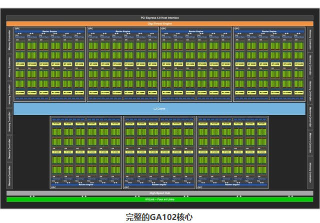 而完整的GA102核心包含7个GPC(图形处理集群)42个TPC(纹理处理集群)以及84个SM(流处理器)组成,这里可以看到完整的GA102每个GPC中包含6个TPC,相比GA106要多出一组。目前只有GeForce RTX 3090使用了近乎完整的GA102核心,大家可以简单看一下两款核心之间的差距。