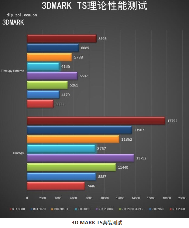 而在针对DX12环境下的Time Spy和Time Spy Extreme测试中,GeForce RTX 3060的分数与GeForce RTX 2070的分数差距缩小,几乎持平。而作为同后缀型号产品GeForce RTX 2060的分数差距在17-20%之间。