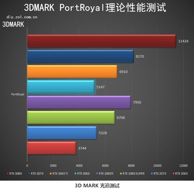 PortRoyal是3DMARK中专门针对光追性能的测试项,通过这组光追性能对比图不难发现GeForce RTX 20系列的显卡性能呈较规则的递增形式,而在GeForce RTX 30系显卡中,GeForce RTX 3080的性能有非常大的提升,与GeForce RTX 3070相比有40%的提升。而GeForce RTX 3060 Ti与GeForce RTX 3070之间的差距与GeForce RTX 20系提升幅度比较吻合。