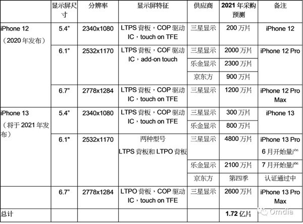 2021年,苹果预计将从三星显示、乐金显示和京东方购买1.72亿片柔性OLED面板(该数字比最初预测的1.69亿片略有上升),京东方目前是iPhone 12的柔性OLED面板供应商。对于新的iPhone 13,京东方的面板正在认证通过中,预计将在2021年第四季度开始量产。