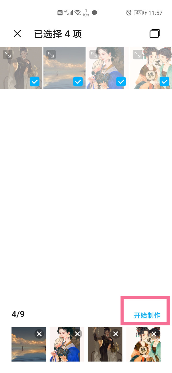 2、勾选需拼接的图片素材,点击【开始制作】。