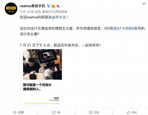 根据官方之前释放的消息,realme真我GT大师系列是realme继续携手深泽直人的全新力作,而在今天realme更是公布了另一则重磅消息,发布会当天将请“realme的新朋友”作为特邀体验官到访发布会现场——这便是与手机圈颇有渊源的罗永浩。
