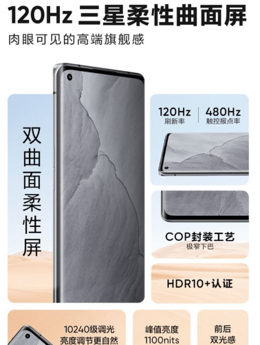从realme官方微博公布的新机图可以提前了解到,realme真我GT大师版此次正面将会采用曲面屏的设计方案,极有可能为AMOLED材质,或将支持120Hz高刷,支持DC调光,同时它的触控采样率也达到了480Hz,将会提供十分顺滑、迅速的多场景操控体验。