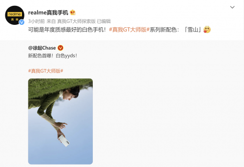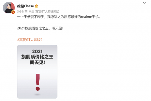 值得一提的是, realme副总裁、中国区总裁、全球营销总裁徐起,从官宣后就持续针对“质价比”议题发起提问,今天则为新品定调“2021旗舰质价比之王”。可以预见,真我GT大师系列将是同价位段中质价比无敌的旗舰手机。