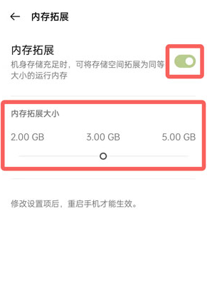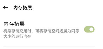 这个功能类似于一个辅助功能,例如手机是6GB运行内存,存储空间是128GB,开启内存拓展并将内存拓展大小设置为3GB,存储空间将会减少3GB变为125GB,运行内存将会得到增加变成6GB+3GB=9GB,关闭内存扩展之后,内存和运行内存将会恢复。