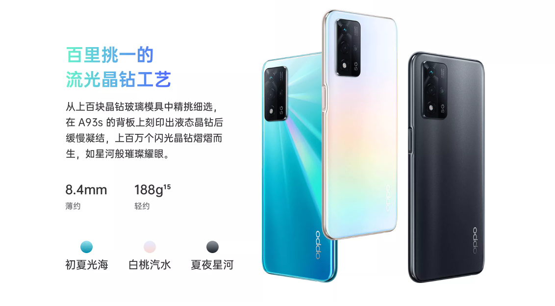 从OPPO官网了解到,A93s在背部采用流光晶钻工艺设计,拥有初夏光海、白桃汽水、夏夜星河三种时尚的配色,整体颜值非常高。比较难得的是,A93s在内置5000mAh电池的基础上,机身厚度和重量仅有8.4mm、184g(可能出现±3g的重量偏差和0.2mm的厚度偏差),这在行业中非常少见,日常使用时可以带来不错的持握手感。