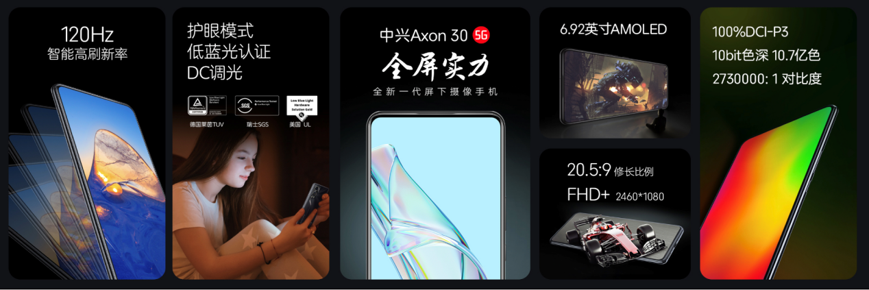 规格方面,中兴Axon 30 5G采用6.92英寸AMOLED屏幕,支持120Hz高刷新率+360Hz触控采样率,支持10.7亿色显示和DC调光,通过了德国莱茵TUV、瑞士SGS、美国UL护眼认证。