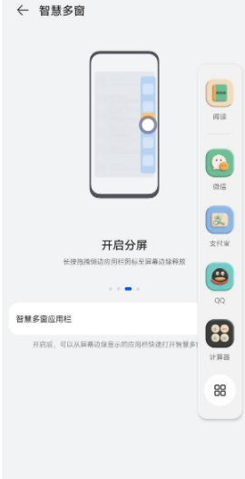 1、从屏幕左边缘或右边缘向内滑动并停顿,呼出智慧分屏应用栏。