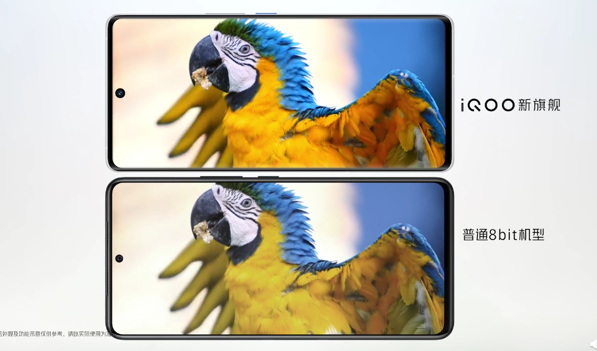 超过8bit色深则暗示iQOO 8系列支持10bit色深,色深越高,能容纳的颜色也就越多,因此色彩的过渡渐变就做的细腻不割裂不断层,显示效果自然柔和。
